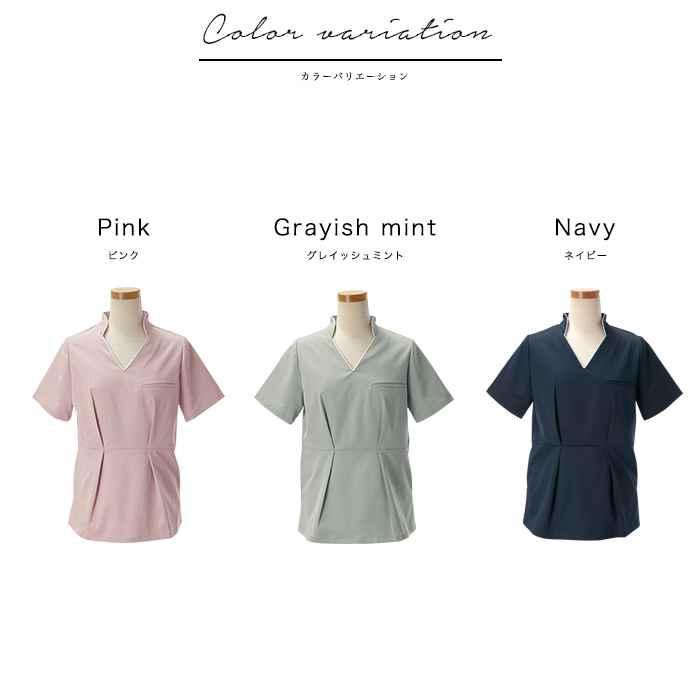 立ち襟にVネックとパイピングのコンビネーションが美しいスクラブ。
